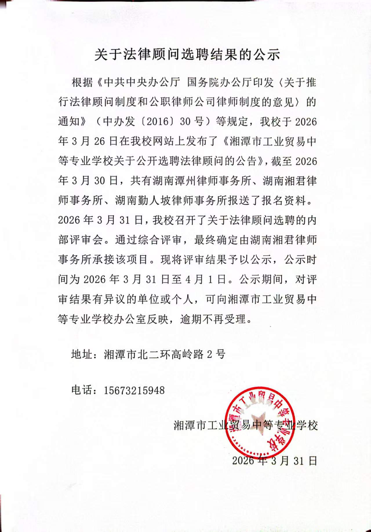 湘潭市工业贸易中等专业学校 关于公开选聘法律顾问的公告
